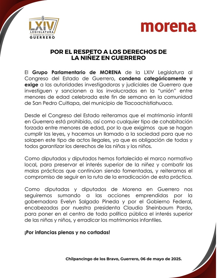 A través de un comunicado difundido esta noche, los diputados de Morena recordaron que el matrimonio infantil está prohibido en Guerrero, así como cualquier tipo de cohabitación forzada entre menores de edad, por lo que exigieron que se hagan cumplir las leyes.