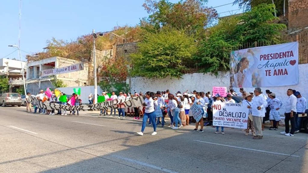 Prestadores de servicios de Puerto Vicente Guerrero protestaron en la avenida Costera, bajo el puente que conecta la Terminal Marítima con el Fuerte de San Diego, para exigir a la presidenta Claudia Sheinbaum que evite que los desalojen de su centro de trabajo.