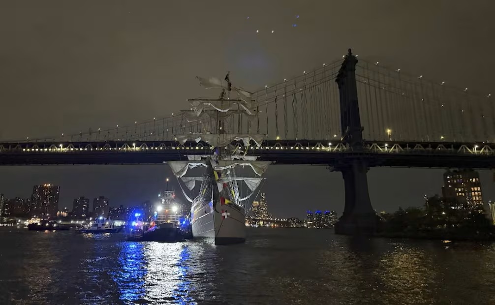 Buque de la Armada de México choca contra puente de Brooklyn en Nueva York. (17/05/25) Foto: AP Photo
