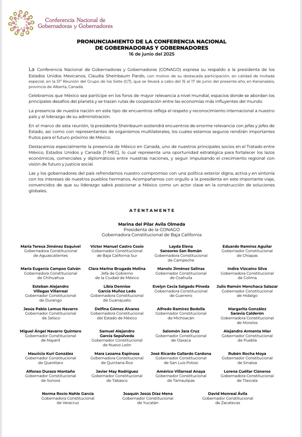 El pronunciamiento está firmado por Marina del Pilar Avila Olmeda, presidenta de la CONAGO y gobernadora de Baja California, así como por las y los titulares de los gobiernos estatales del país, incluyendo a Evelyn salgado Pineda.