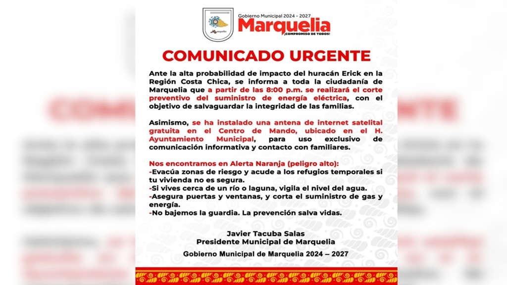 El Gobierno de Marquelia informó que este miércoles a las 20 horas se hará un corte preventivo de energía eléctrica en el municipio como medida de seguridad ante el impacto del huracán Erick por la región Costa Chica del estado.