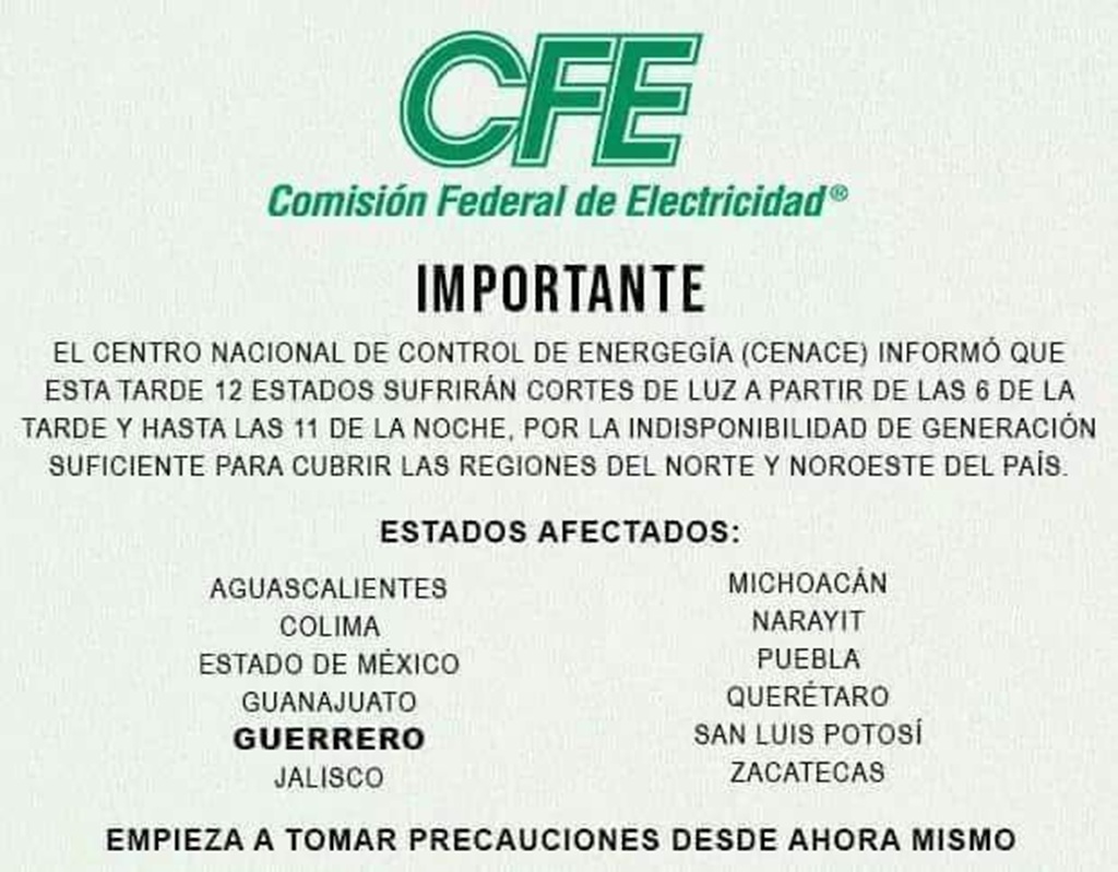 Respecto al anuncio de alerta de la Comisión Federal de Luz, sobre la suspensión de energía en 12 estados del país, entre ellos Guerrero, a partir de las 6 de la arde hasta las 11 de la noche. Trascendió que la misma dependencia desmintió el enunciado.
