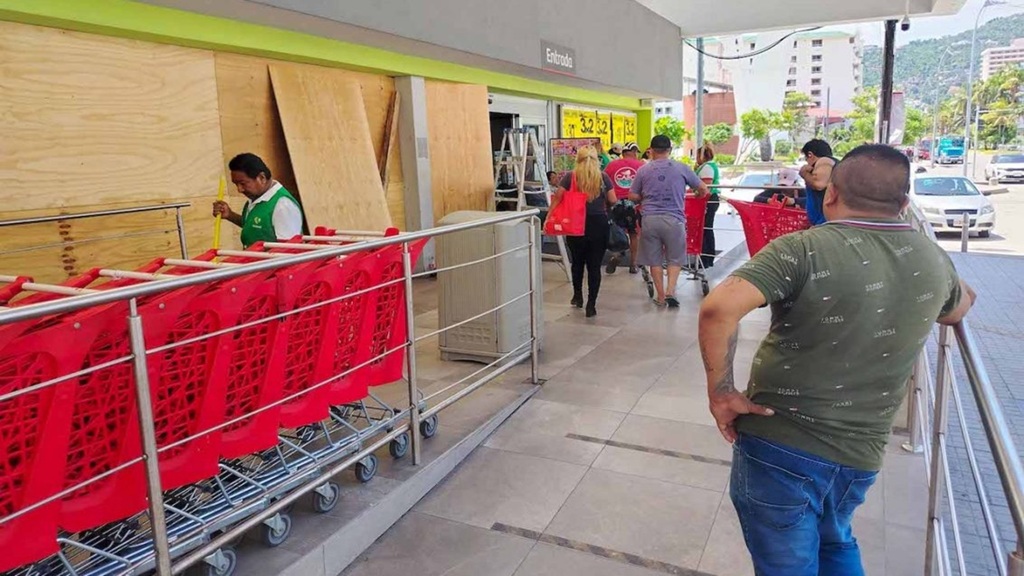 Desde las 9 de la mañana en establecimientos como el banco Banorte y el supermercado Soriana Super, de Costa Azul, trabajadores colocaron paneles de plástico especial para soportar los fuertes vientos y mamparas en el supermercado, que también ayudan a evitar la irrupción de personas.
