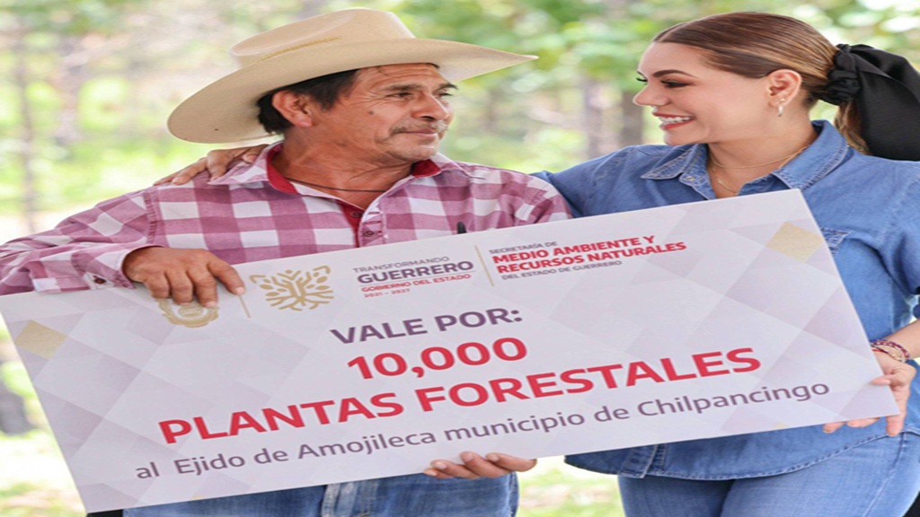 Durante el evento, la mandataria estatal entregó vales simbólicos para reforestar con 3 mil plantas a la Universidad Autónoma de Guerrero; 2 mil a comunidades rurales; y 10 mil al presidente del ejido de Amojileca.