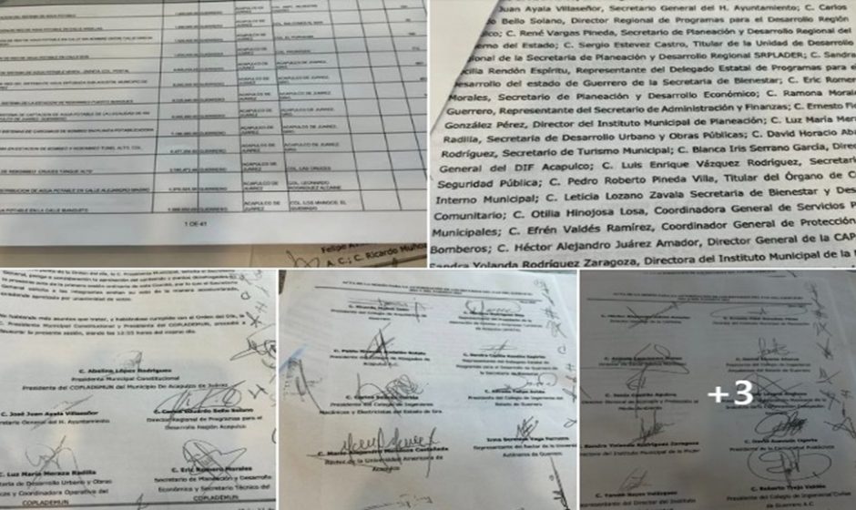 Acta firmada no solo por integrantes del Gobierno Municipal de Acapulco, presidido por Abelina López Rodríguez, sino por representantes de diversas dependencias como Zofemat, Luz María Meraza Radilla, secretaría general, Desarrollo Urbano y Obras Públicas, Planeación y Desarrollo, Bienestar y Desarrollo Comunitario (a cargo de Leticia Lozano Zavala).