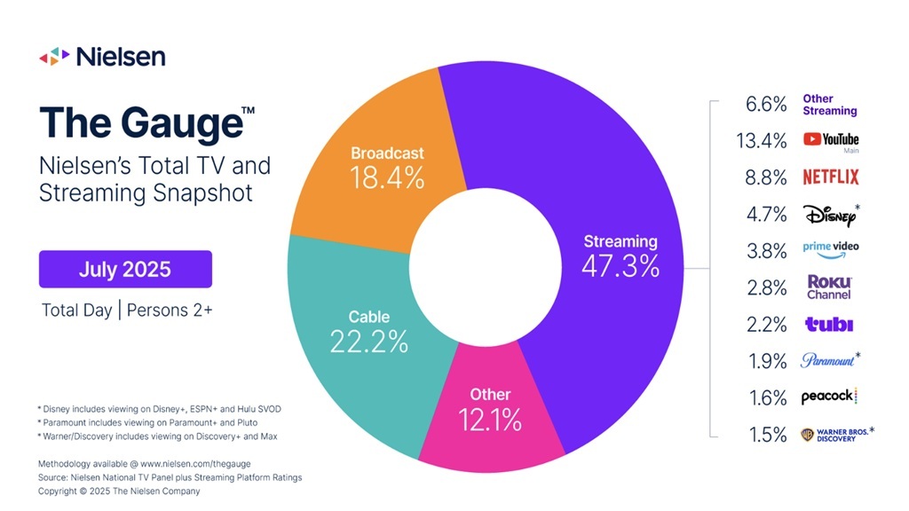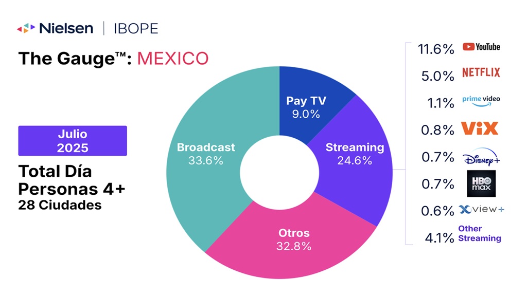 En México, de acuerdo al Nielsen Gauge Report, el consumo en streaming representó el 24.6% del total de visualización de televisión durante julio del 2025.