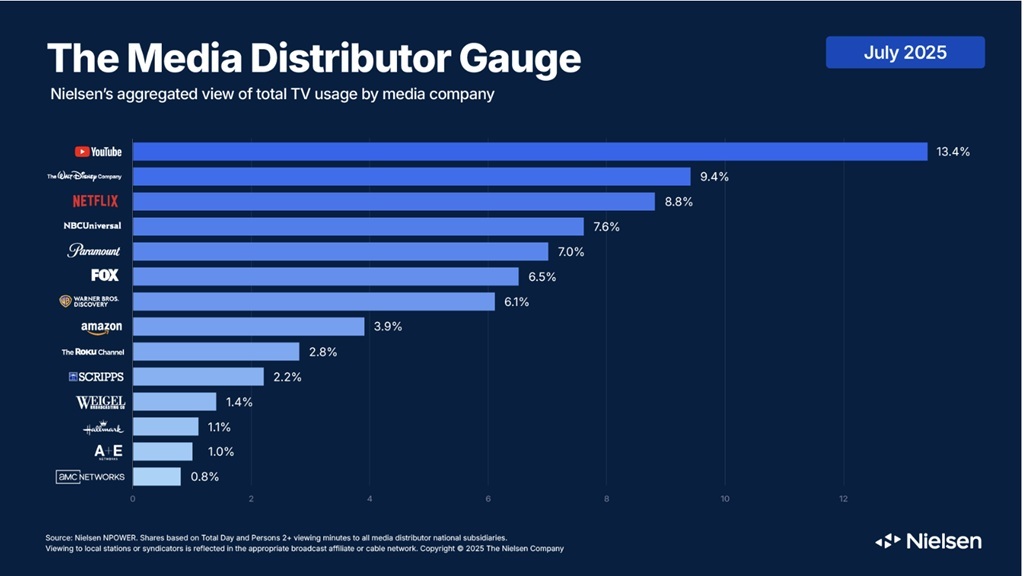 En el Media Distribution Gauge, YouTube con 13.4% supera tanto a sus competidores en streaming como a las principales cadenas televisivas.