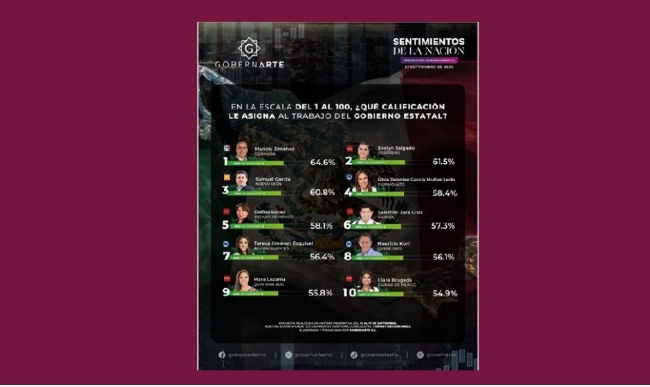 Dicho estudio, realizado en la entidad en el periodo comprendido del 12 al 17 de septiembre, con una muestra estratificada de 525 encuestas, contando con el 95 por ciento de confianza, calificó a Manolo Jiménez, gobernador de Coahuila con el 64.6 por ciento, tan solo 3.1 puntos porcentuales arriba de la mandataria guerrerense.