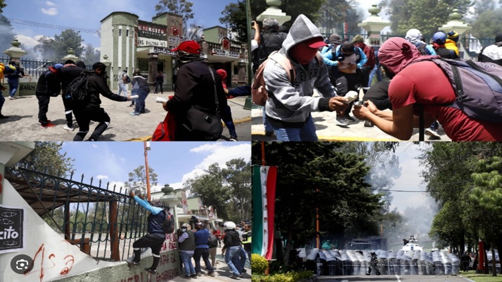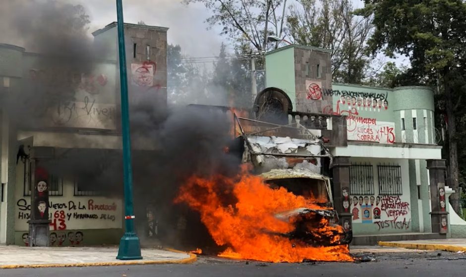 Una humareda negra y múltiples explosiones fueron parte de los hechos que acompañaron las protestas por el 11 aniversario de la desaparición de los 43 normalistas de la Escuela Normal Rural Isidro Burgos de Ayotizinapa.