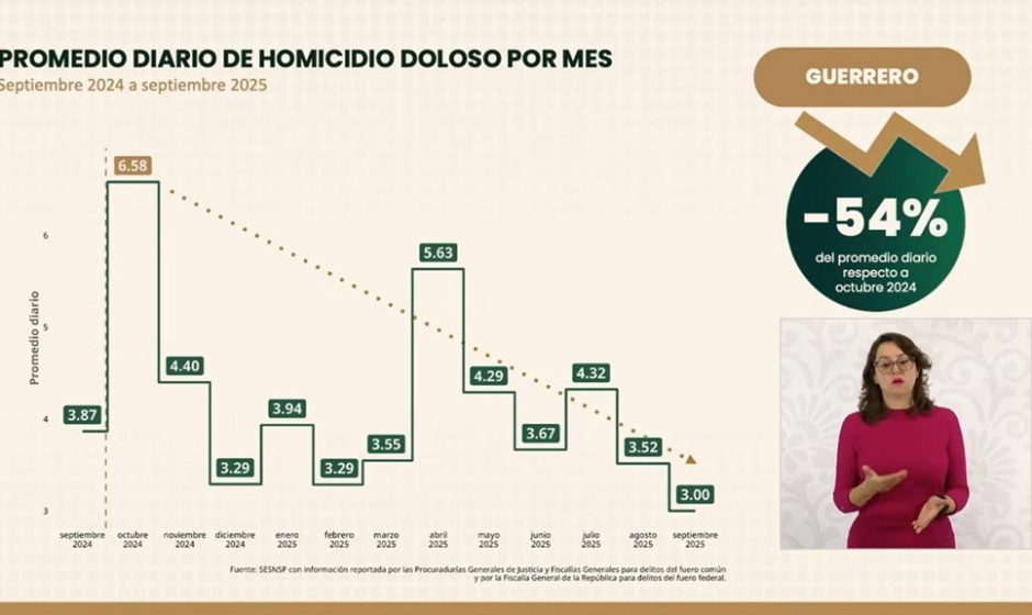 Durante la conferencia matutina de la presidenta Claudia Sheinbaum, la titular del Secretariado Ejecutivo del Sistema Nacional de Seguridad Pública (Marcela Figueroa Franco) presentó las cifras oficiales correspondientes a septiembre de 2025, donde Guerrero alcanzó su menor número de homicidios dolosos en lo que va del año, con 90 casos y un promedio diario de 3 homicidios, lo que representa una reducción del 54% respecto a octubre de 2024.