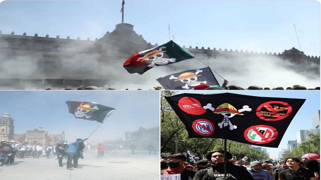 Los jóvenes, hombres y mujeres, que se identifican con la Generación Z, utilizan símbolos de la cultura pop como banderas inspiradas en el anime One Piece, como la calavera con sombrero de paja, que fue utilizada por los jóvenes de la misma generación en las protestas de Nepal, país que se encuentra al sur de Asia, colindando con China y la India.