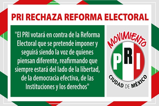 El PRI votará en contra de la Reforma Electoral que se pretende imponer y seguirá siendo la voz de quienes piensan diferente, reafirmando que siempre estará del lado de la libertad, de la democracia efectiva, de las Instituciones y los derechos.
