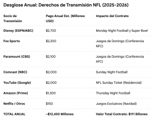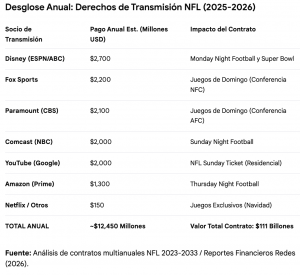 Al día de hoy, los distintos acuerdos de la NFL registran un valor de 111 mil millones de dólares distribuidos en contratos de 11 años, un promedio de 10 mil a 12 mil millones de dólares por temporada.