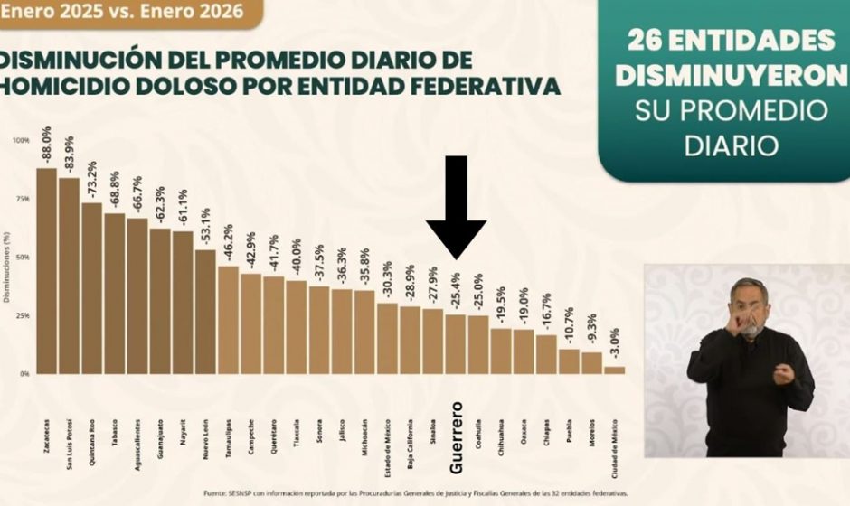 Como resultado de las acciones y estrategias de seguridad implementadas por la gobernadora Evelyn Salgado Pineda, Guerrero continúa consolidando una tendencia sostenida a la baja en la incidencia de homicidio doloso, posicionándose en el lugar 19 a nivel nacional en reducción del promedio diario de este delito, con una disminución del 25 por ciento, de acuerdo con cifras presentadas por la titular del Secretariado Ejecutivo del Sistema Nacional de Seguridad Pública, Marcela Figueroa Franco.