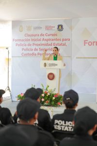 Acompañada por el secretario de Seguridad Pública Estatal, Daniel Ledesma Osuna, la mandataria estatal realizó la clausura oficial del curso de formación inicial aspirantes para Policía de Proximidad, Policía de Seguridad y Custodia Penitenciaria, en el que egresaron 80 nuevos elementos, 39 mujeres y 41 hombres, quienes concluyeron una preparación física, técnica y académica, orientada al respeto absoluto de los derechos humanos, disciplina operativa y capacidad de reacción ante situaciones de riesgo.