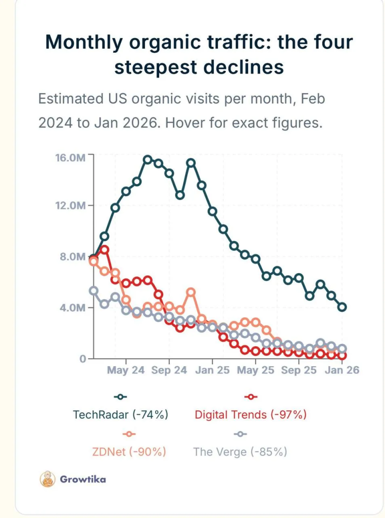 -En Growtika, analizaron el tráfico orgánico de las publicaciones líderes en la industria tecnológica desde el 2024.