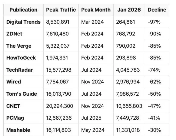 - Digital Trends, ZDNet, The Verge y HowtoGeek con caídas iguales o mayores al 85%.