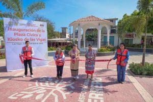 Enseguida, la mandataria estatal en compañía de las autoridades presentes, realizaron la inauguración de la rehabilitación de la Plaza Cívica y el Kiosco, en donde se invirtieron cerca de 5.5 millones de pesos; adicionalmente y por tratarse de una obra integral, también se realizó la pavimentación con concreto hidráulico de la calle Cuauhtémoc, así como obras de rehabilitación de la red de drenaje y agua potable, con recursos por el orden de 6.9 millones de pesos, sumando poco más de 12 millones invertidos.